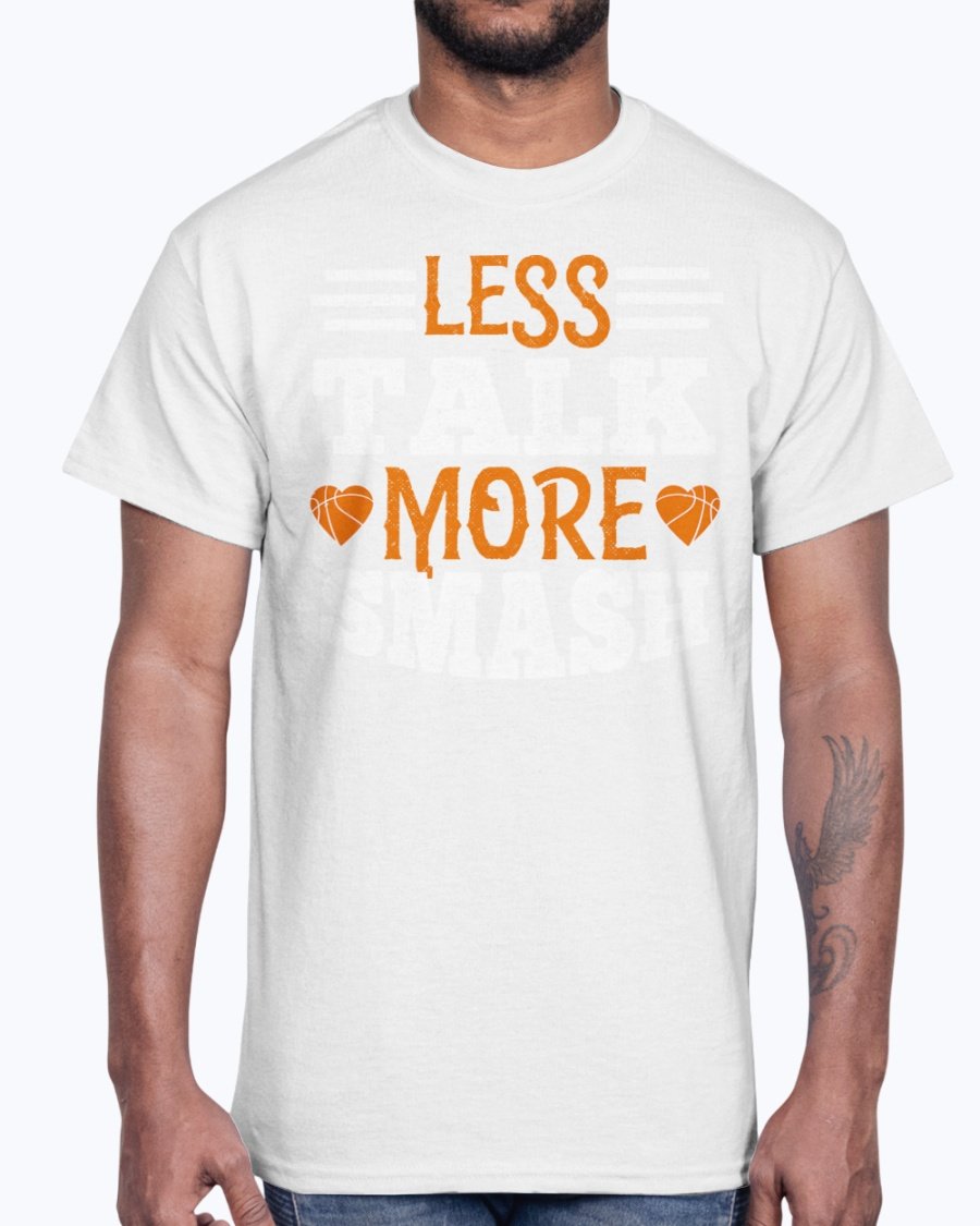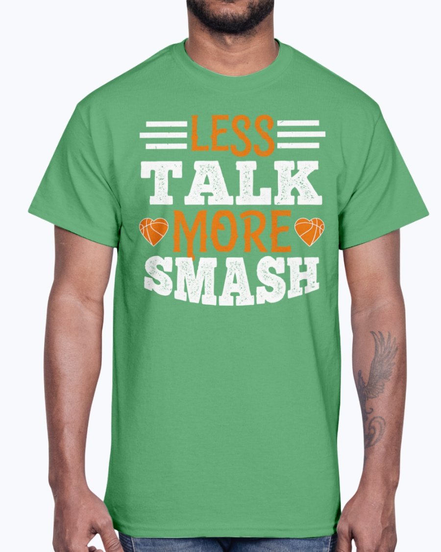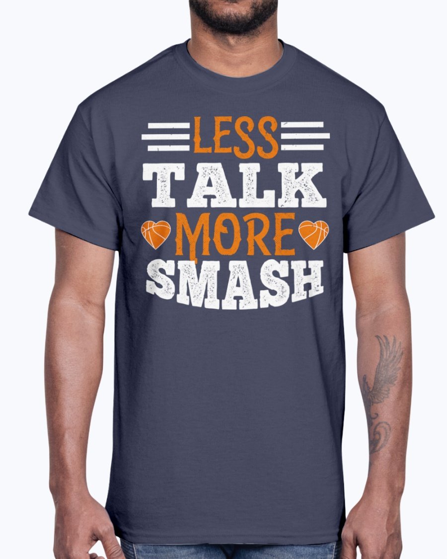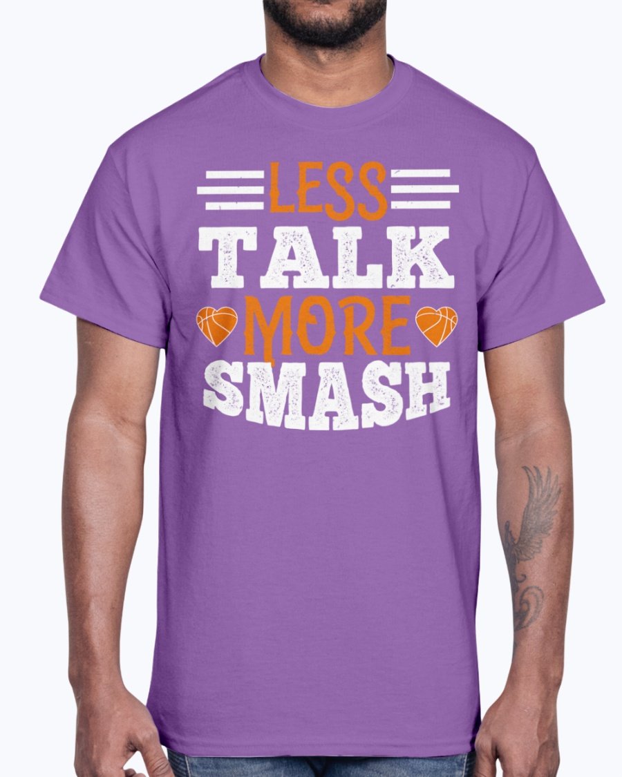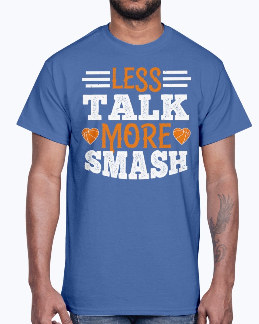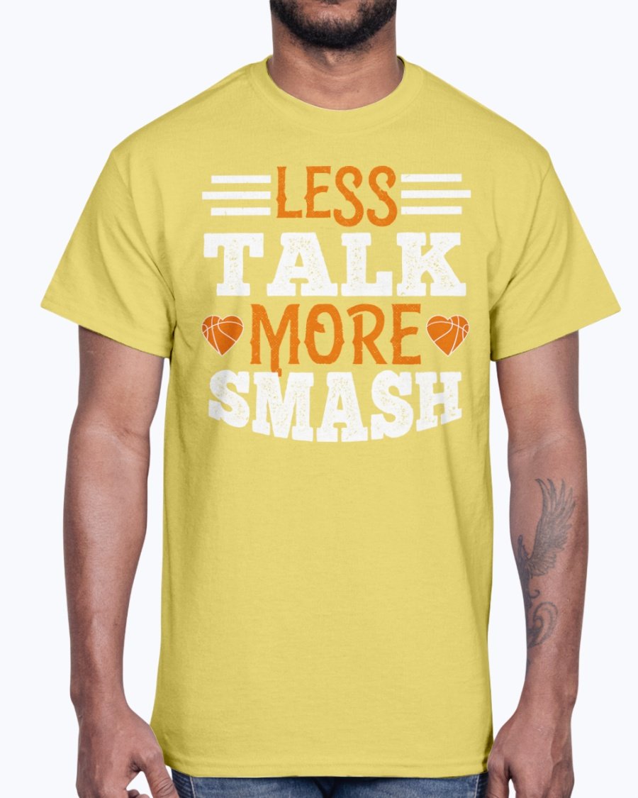 Less talk, more smash  - Basketball - Cotton Tee Note: There is a 2 - 4 day creation time, which may delay shipping.   6 oz.(US) 10 oz.(CA), 100% preshrunk cotton Ash Grey: 99/1 cotton/polyester Heather colors & Safety colors: 50/50 cotton/polyester Antique colors & Sport Grey: 90/10 cotton/polyester Classic fit...