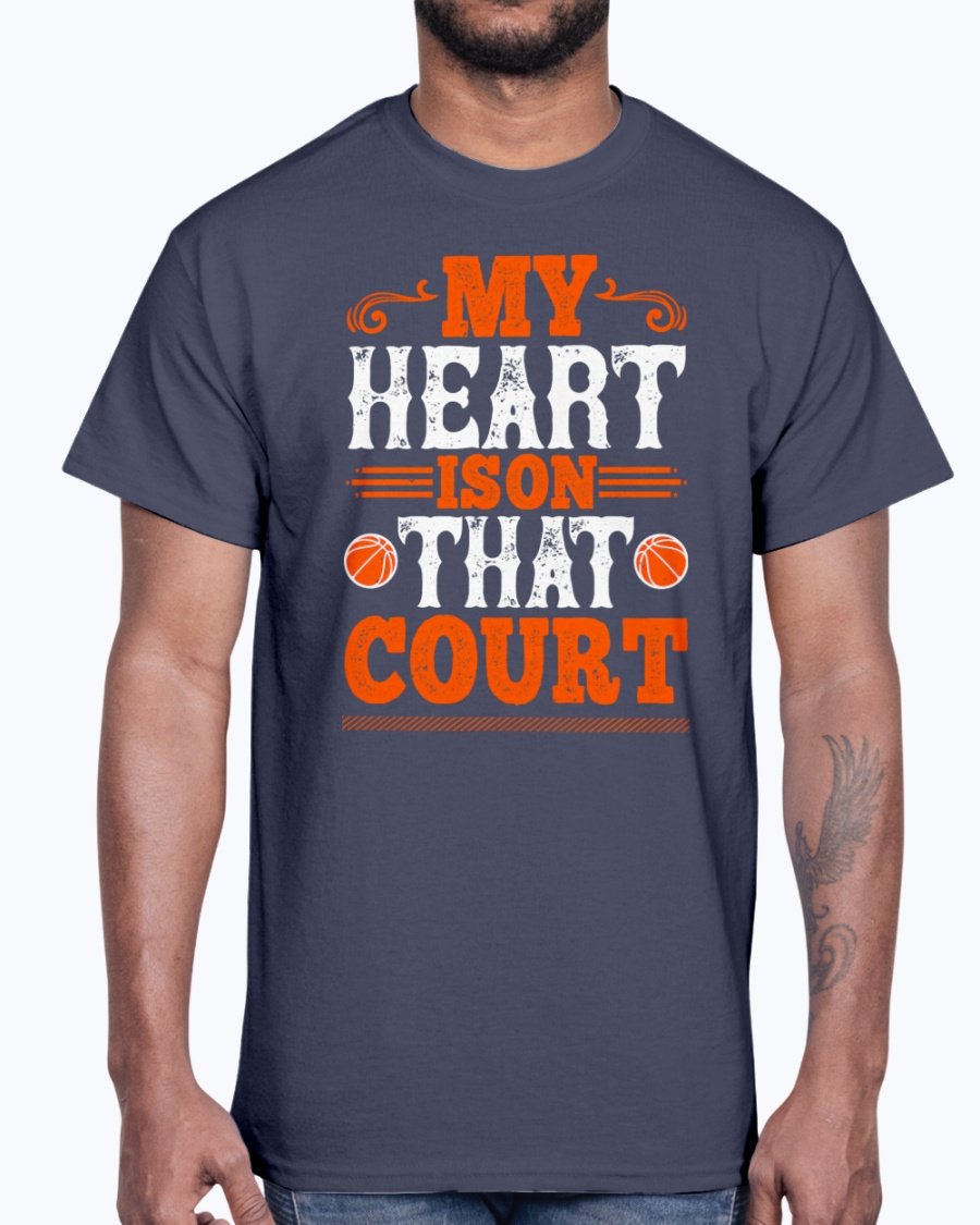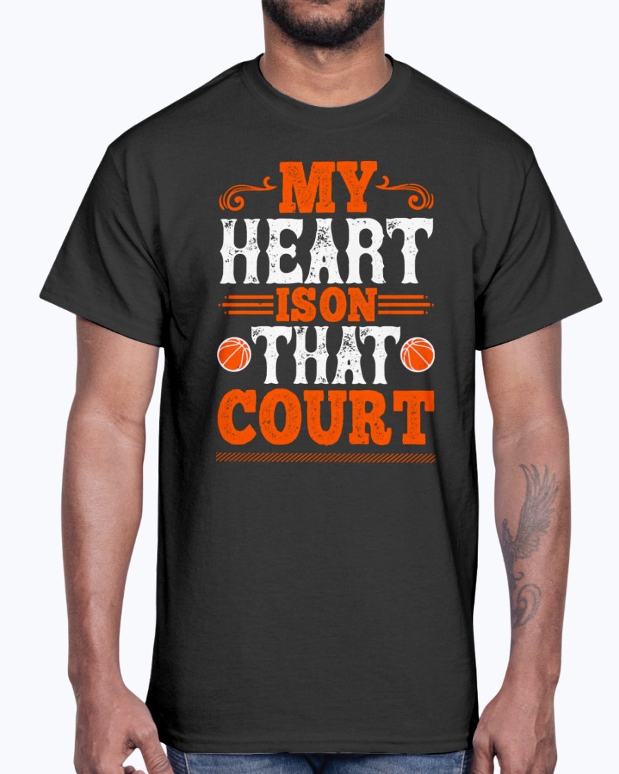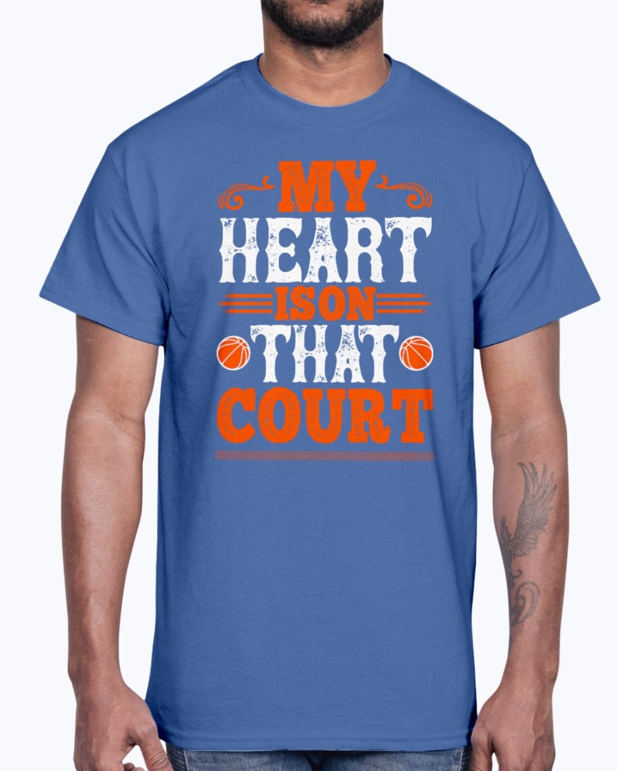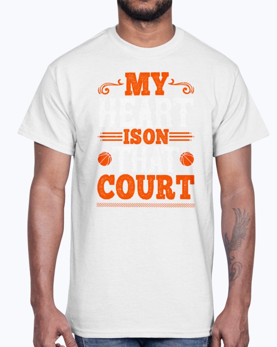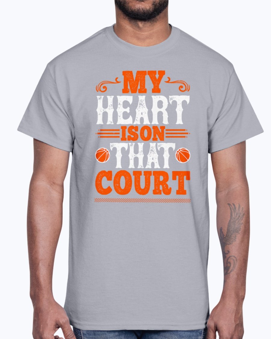 My heart is on that court - Basketball - Cotton Tee Note: There is a 2 - 4 day creation time, which may delay shipping.   6 oz.(US) 10 oz.(CA), 100% preshrunk cotton Ash Grey: 99/1 cotton/polyester Heather colors & Safety colors: 50/50 cotton/polyester Antique colors & Sport Grey: 90/10 cotton/polyester...