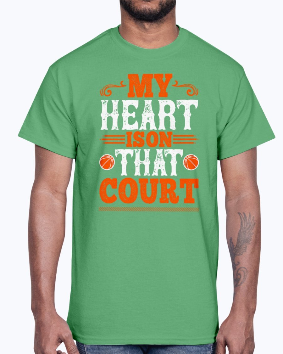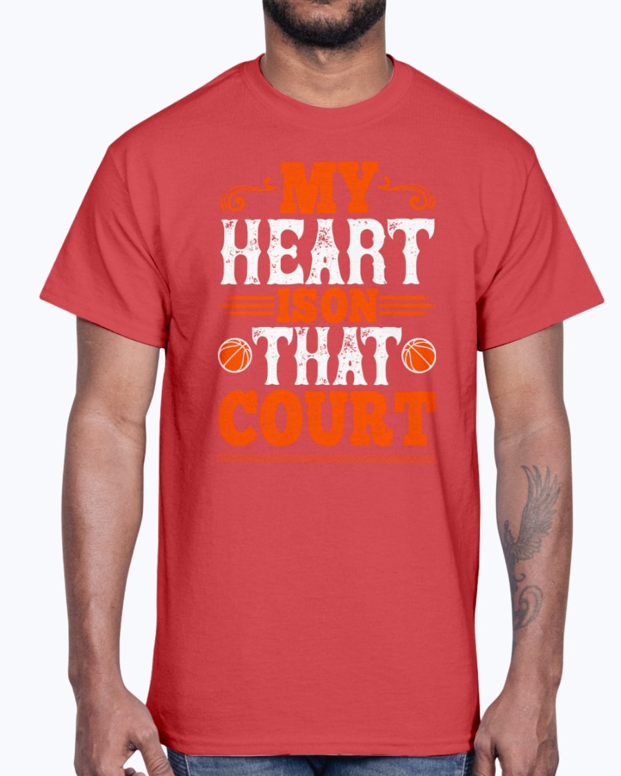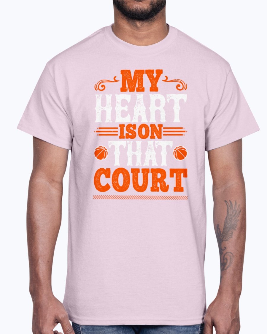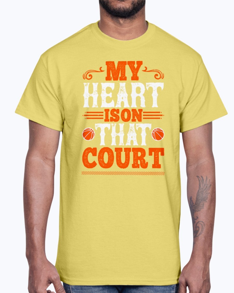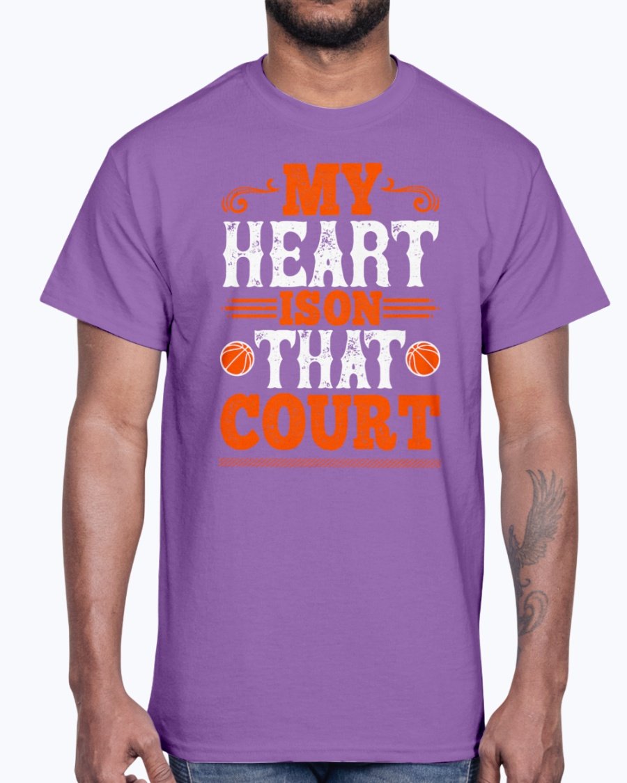My heart is on that court - Basketball - Cotton Tee Note: There is a 2 - 4 day creation time, which may delay shipping.   6 oz.(US) 10 oz.(CA), 100% preshrunk cotton Ash Grey: 99/1 cotton/polyester Heather colors & Safety colors: 50/50 cotton/polyester Antique colors & Sport Grey: 90/10 cotton/polyester...