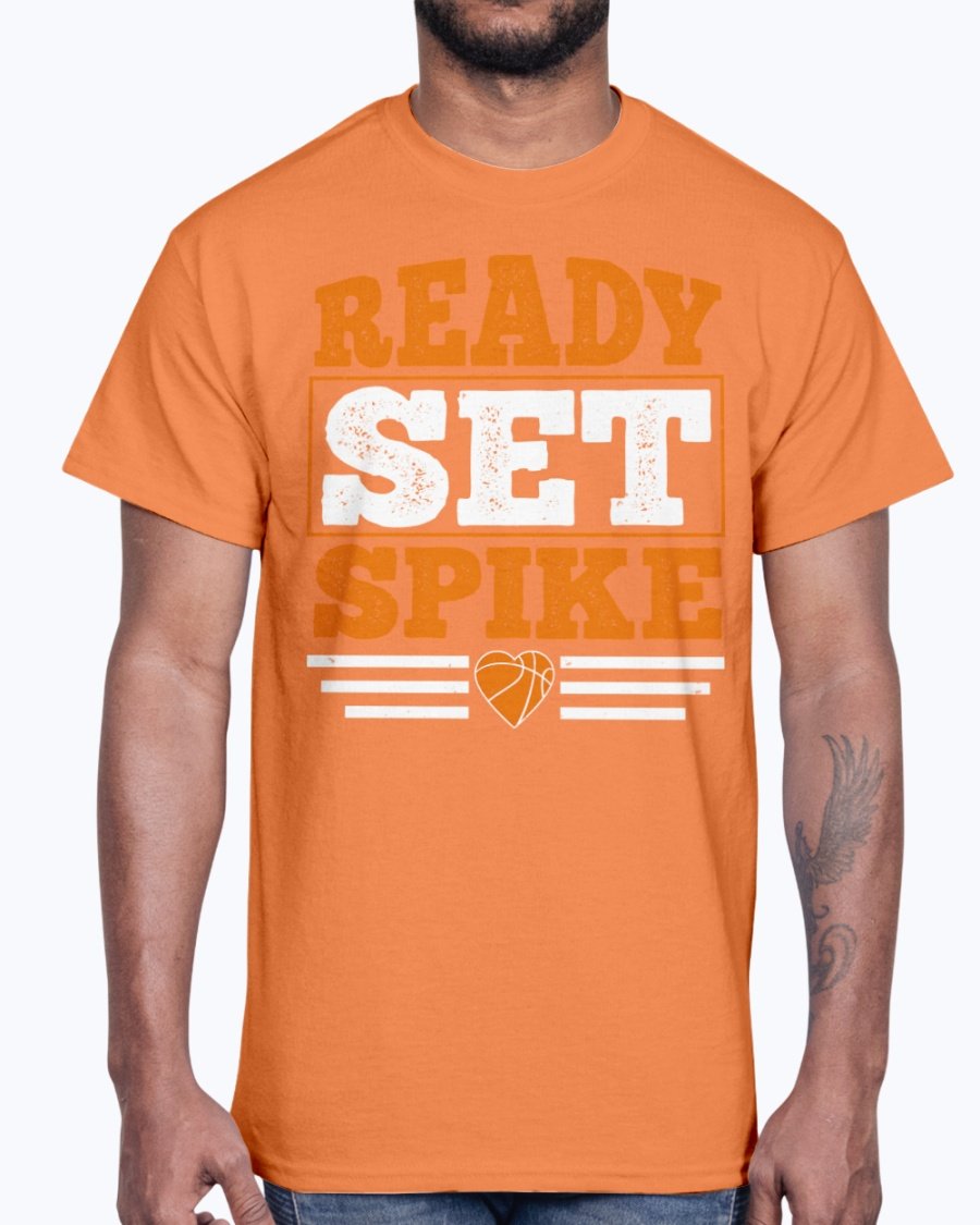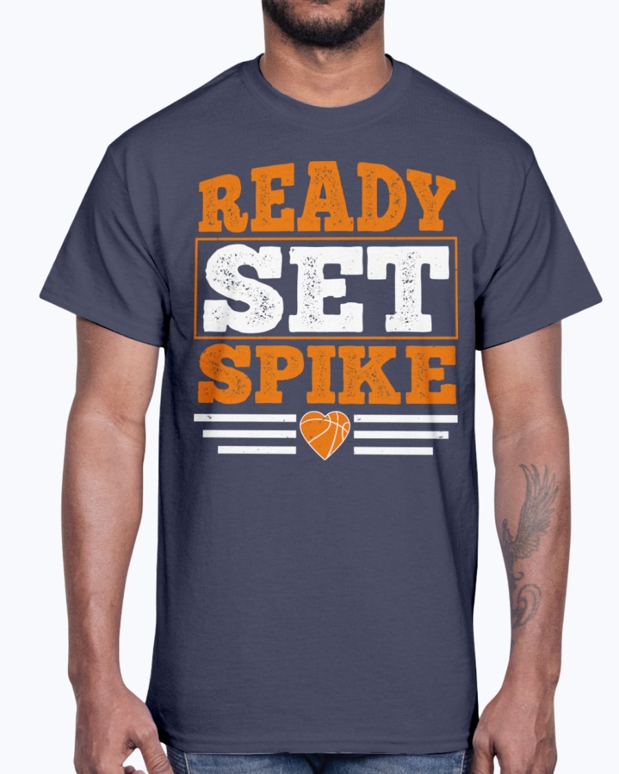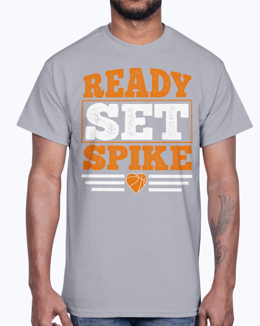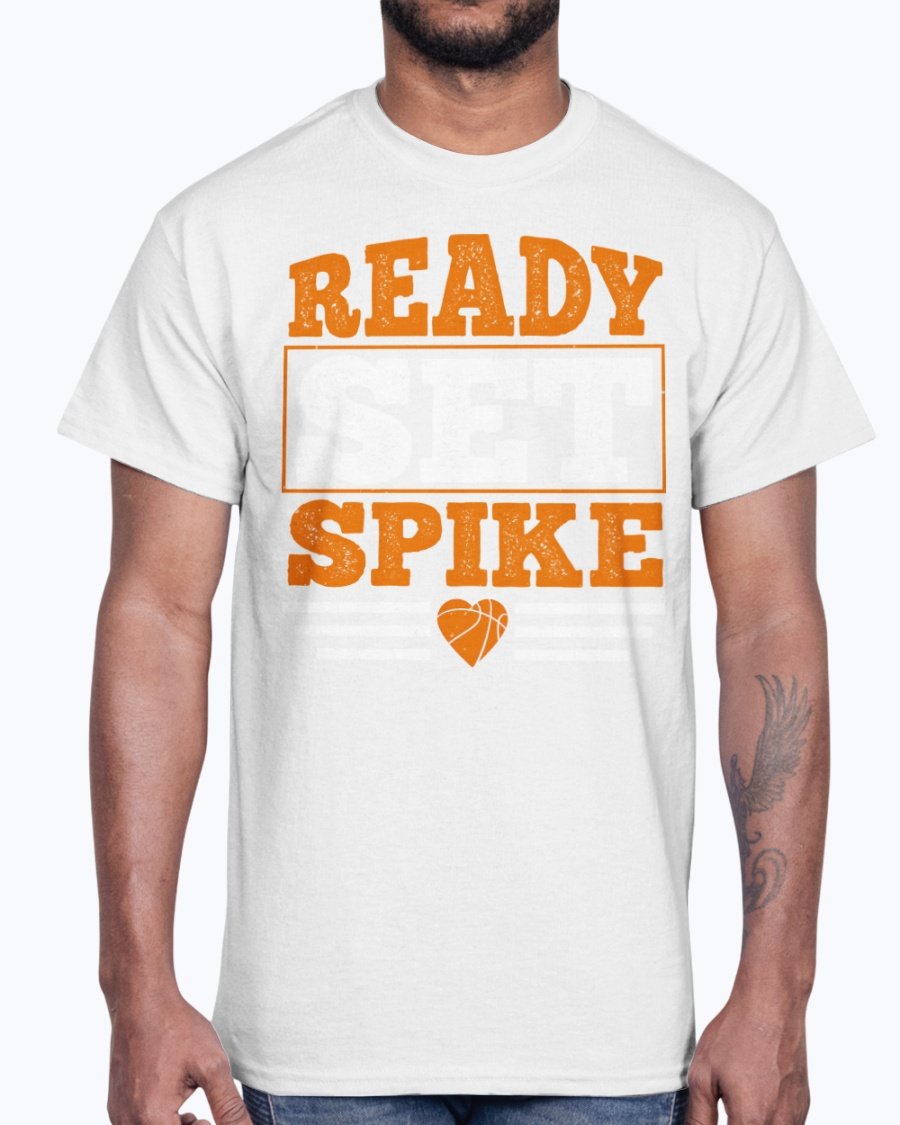 Ready, set, spike - Basketball - Cotton Tee Note: There is a 2 - 4 day creation time, which may delay shipping.   6 oz.(US) 10 oz.(CA), 100% preshrunk cotton Ash Grey: 99/1 cotton/polyester Heather colors & Safety colors: 50/50 cotton/polyester Antique colors & Sport Grey: 90/10 cotton/polyester Classic fit Seamless...
