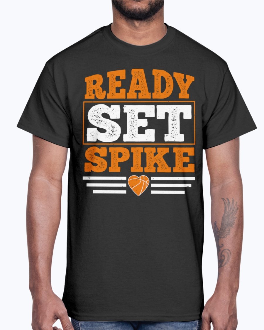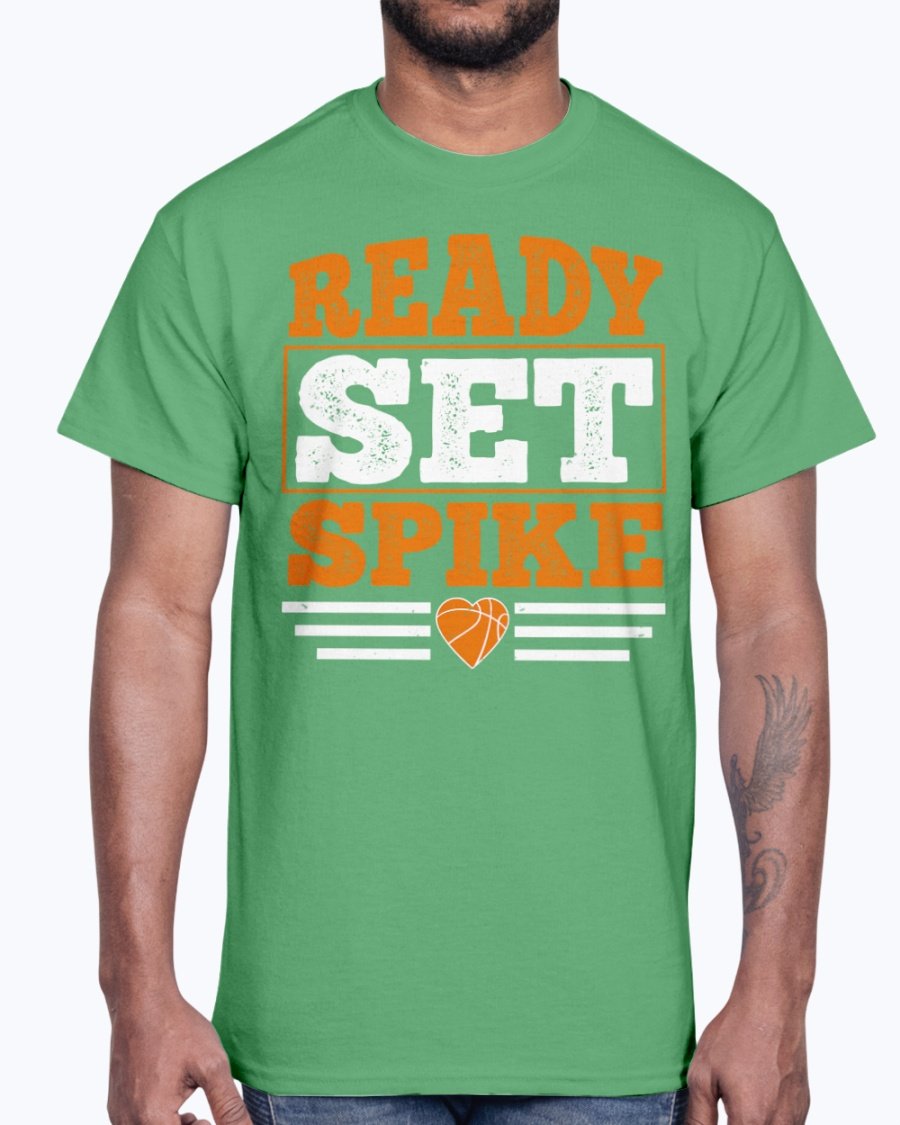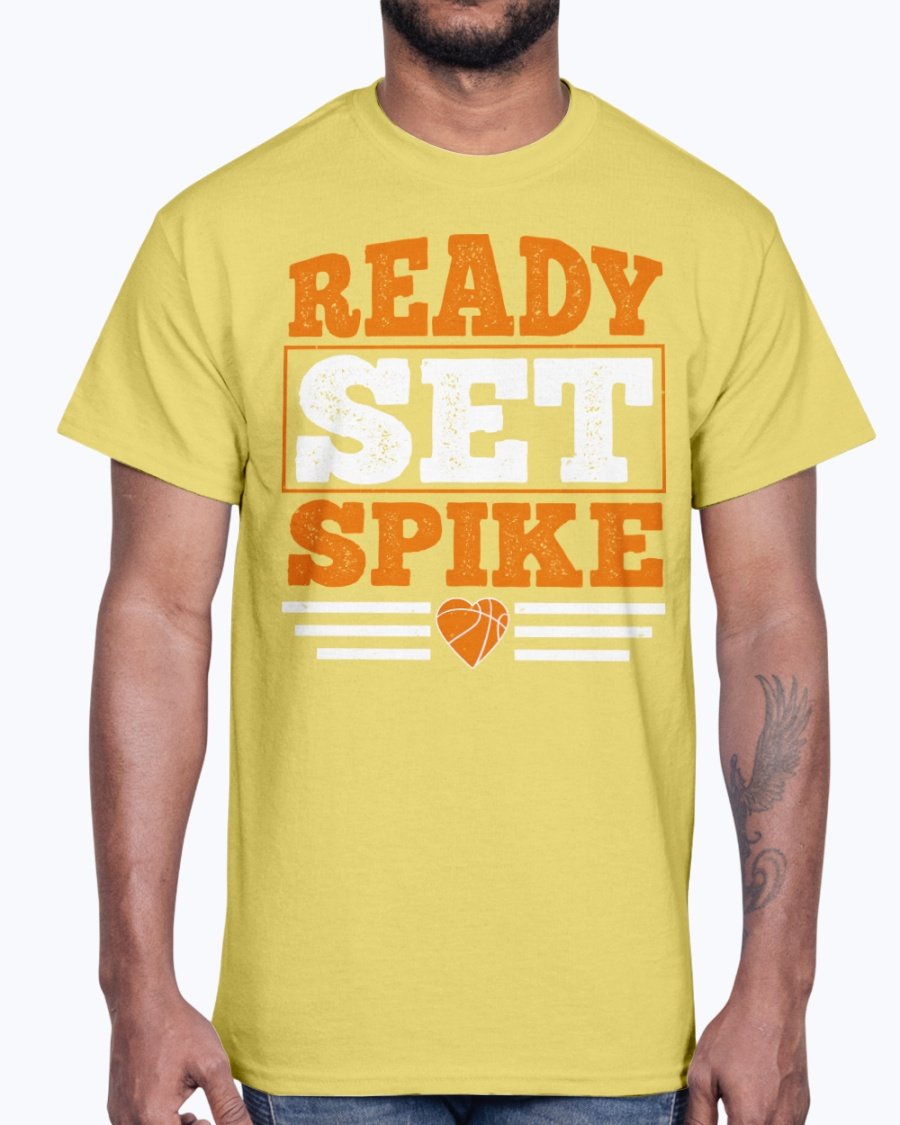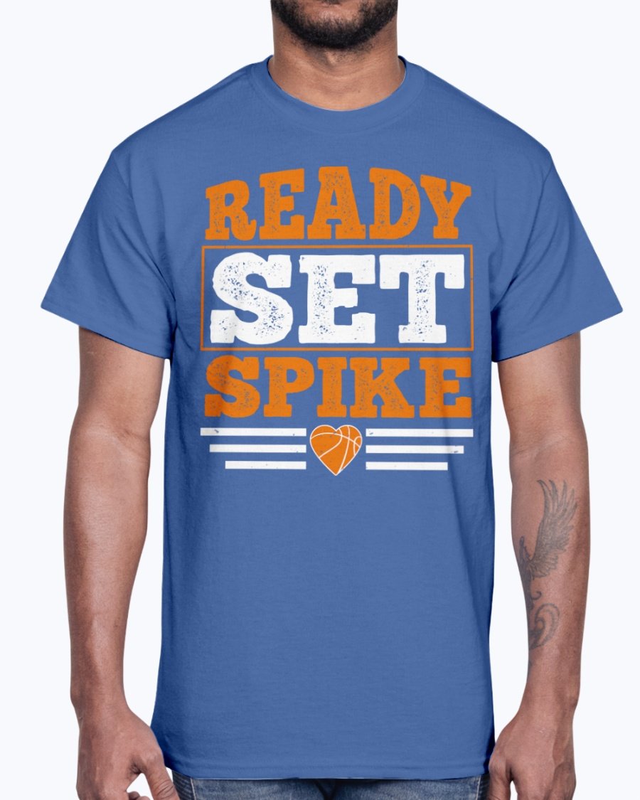 Ready, set, spike - Basketball - Cotton Tee Note: There is a 2 - 4 day creation time, which may delay shipping.   6 oz.(US) 10 oz.(CA), 100% preshrunk cotton Ash Grey: 99/1 cotton/polyester Heather colors & Safety colors: 50/50 cotton/polyester Antique colors & Sport Grey: 90/10 cotton/polyester Classic fit Seamless...