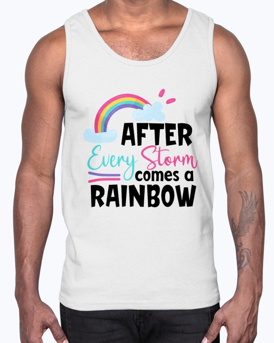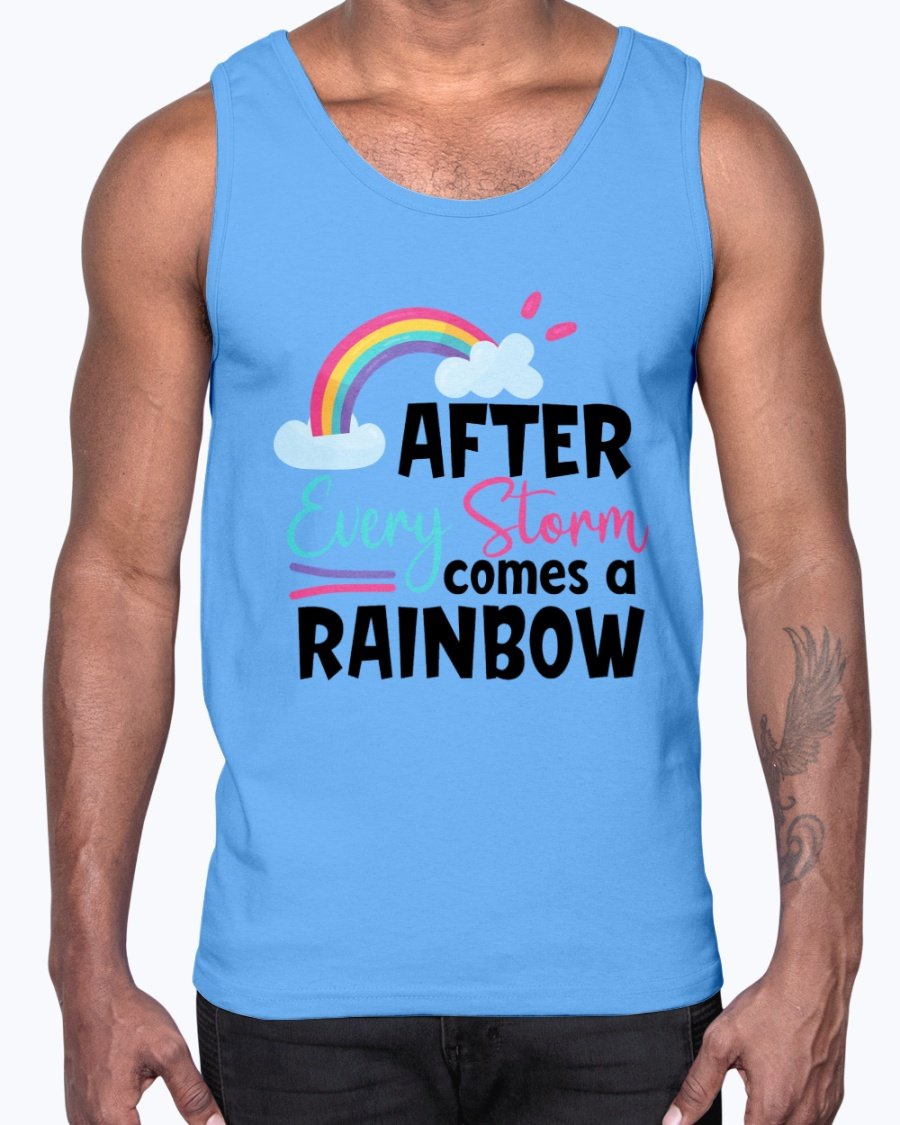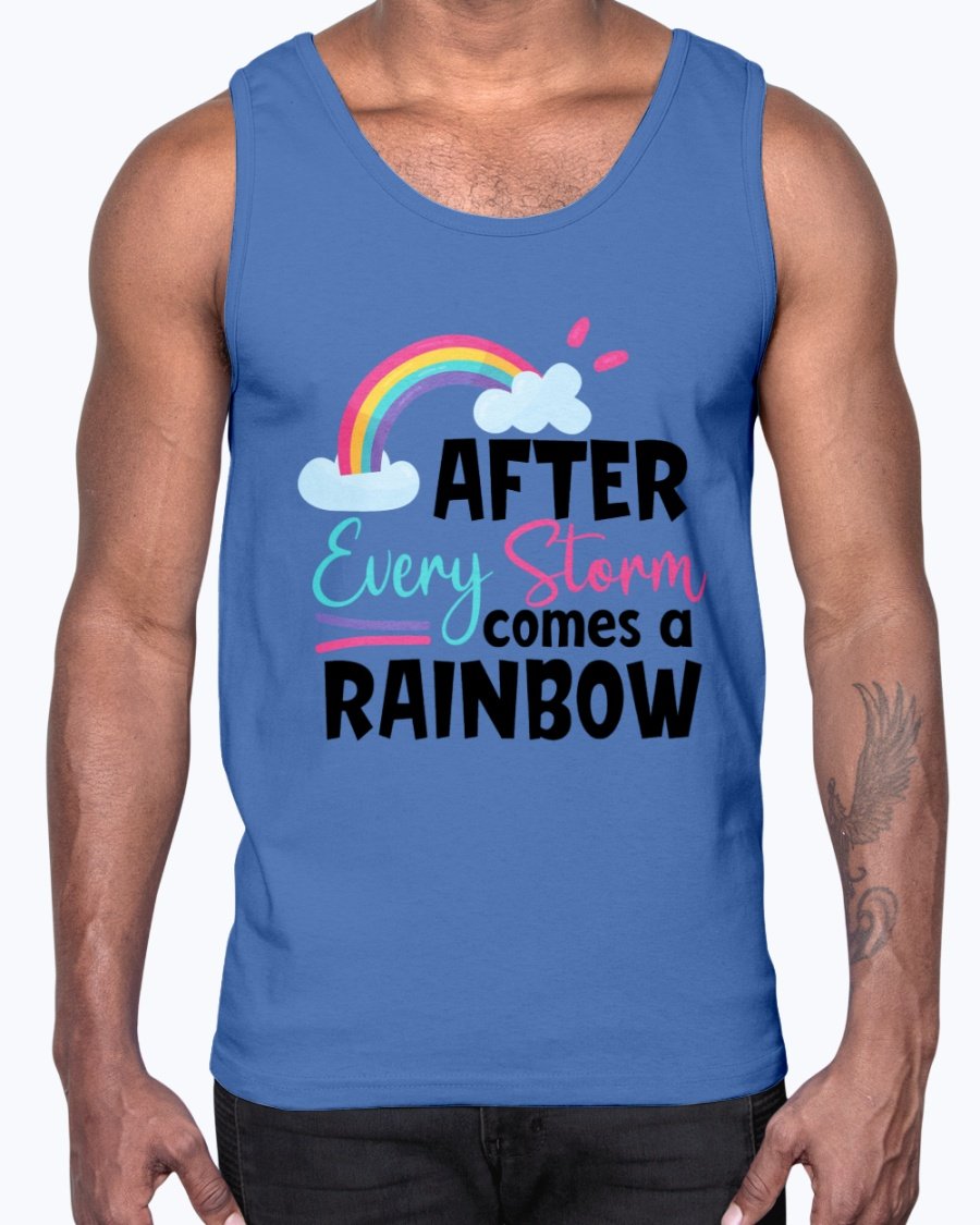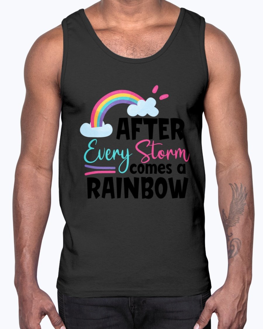 after every storm comes a rainbow- baby- Cotton Tank Note: There is a 2 - 4 day creation time, which may delay shipping. Details Preshrunk jersey knit Banded neck and armholes Tear away label and double-satin label Double-needle bottom hem Quarter-turned to eliminate center crease Fiber content varies by color,...