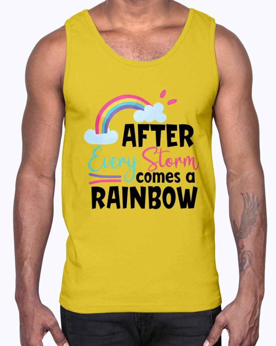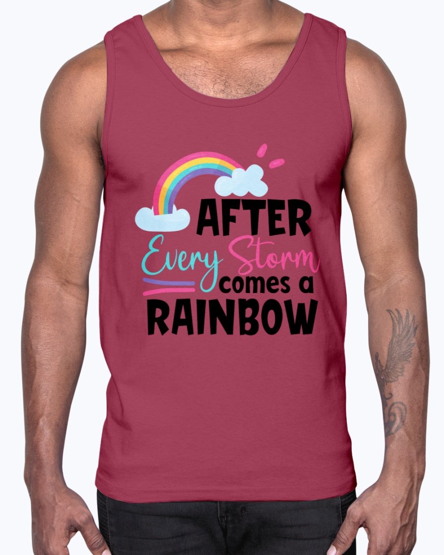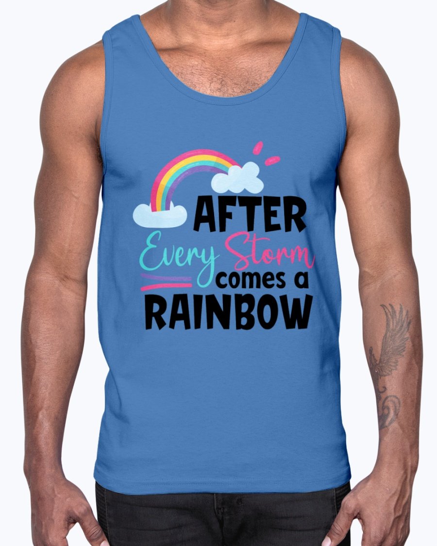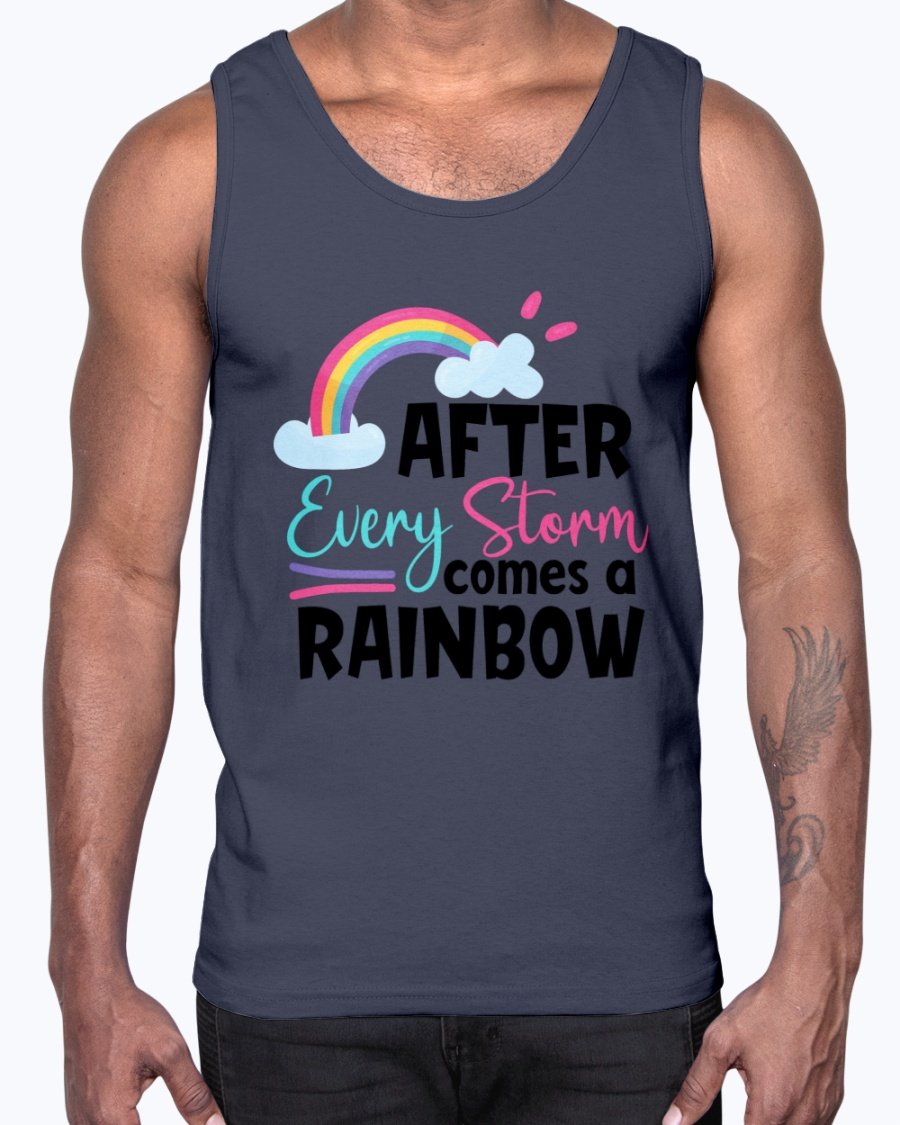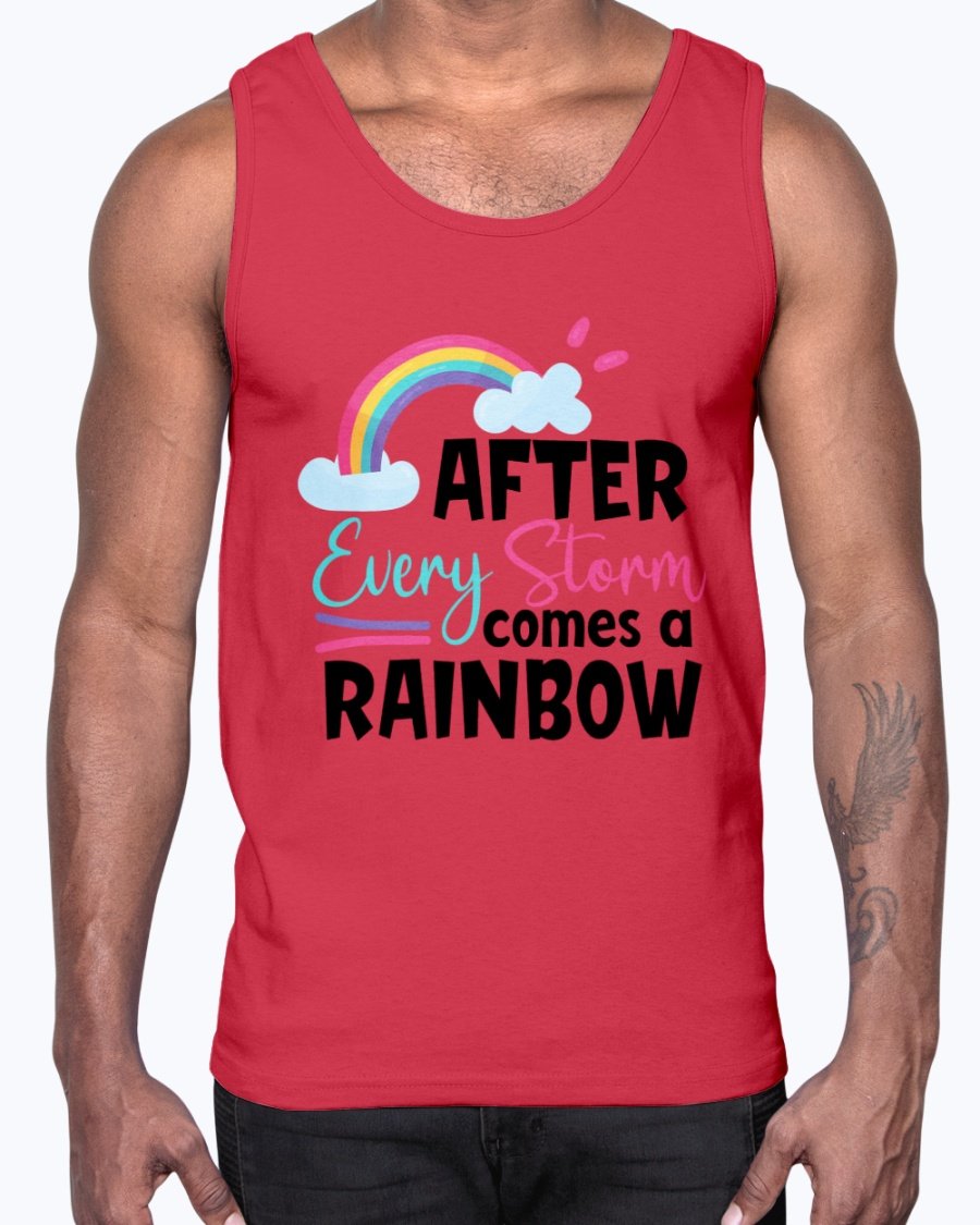 after every storm comes a rainbow- baby- Cotton Tank Note: There is a 2 - 4 day creation time, which may delay shipping. Details Preshrunk jersey knit Banded neck and armholes Tear away label and double-satin label Double-needle bottom hem Quarter-turned to eliminate center crease Fiber content varies by color,...